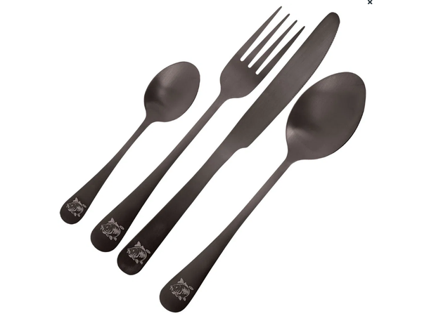 Bestikk-sett med 4 deler i høykvalitets rustfritt stål. Lekkert design i matt børstet stål, med fiskemotiv. Settet leveres i en beskyttende neoprenetaske og er egnet for bruk både på tur og i hjemmet.
